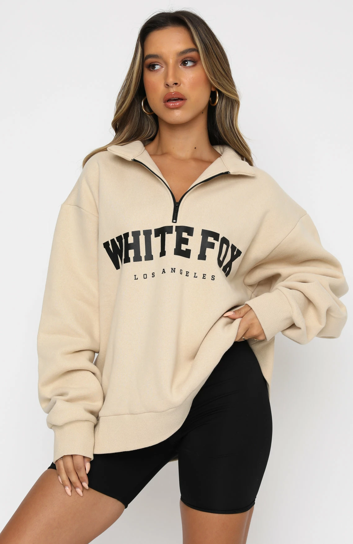 Get that effortlessly chilled vibe on point with the High Standard Zip Front Sweater in Sand. Featuring an oversized fit, vintage feel, zip front, ribbed hemline and cuffs, logo centre front and fleece lined. Style with a pair of our bike shorts for ultimate comfort.
